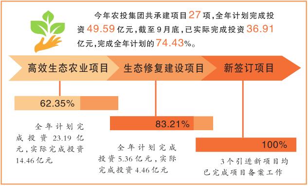2019年,农投集团着力推进现代农业项目建设,大力发展高效生态农业,承建现代农业示范园、现代农业博览园、花卉产业基地、田园综合体农业建设项目4项(其中续建项目2项,新建项目2项),全年计划完成投资23.19亿元,实际完成投资14.46亿元(占年计划的62.35%),其中,花卉产业基地引进的世界顶级玻璃温室建设技术、荷兰智能温室控制系统、以色列先进灌溉技术预计2020年3月可建成投产;着力推进生态修复建设项目,合力创建宜居城市,承建经十五路道路绿化、职教园区山体公园提升改造、国土绿化行动饲草生态种植基地(窝窝井片区生态修复)等生态建设项目5项(其中续建项目1项,新建项目4项),全年计划完成投资5.36亿元,实际完成投资4.46亿元,完成量占年计划的83.21%。